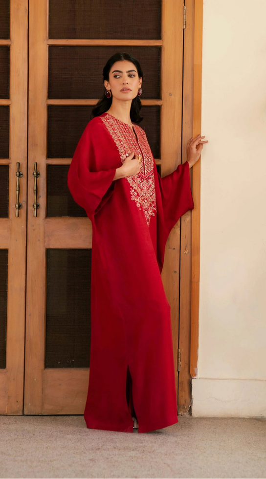 A deep red classic silk kaftan with an intricate ensemble a perfect fit to all your festivities.